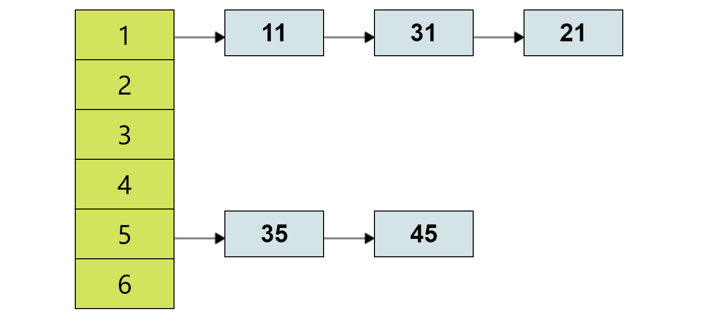 当插入的数据是11, 13, 25, 46, 38时,一切都非常好,所有的货物都能找到自己对应的仓库。但如果这时,又来了一个21,31,就有问题了。这时就会发现,1号仓库已经被11占据了。这种情况就是发生了冲突了。