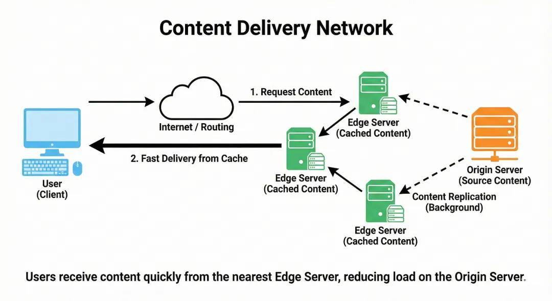 CDN是一个由地理位置分散的服务器组成的网络,它将静态内容(如图像、视频和脚本)缓存到更靠近用户的位置。