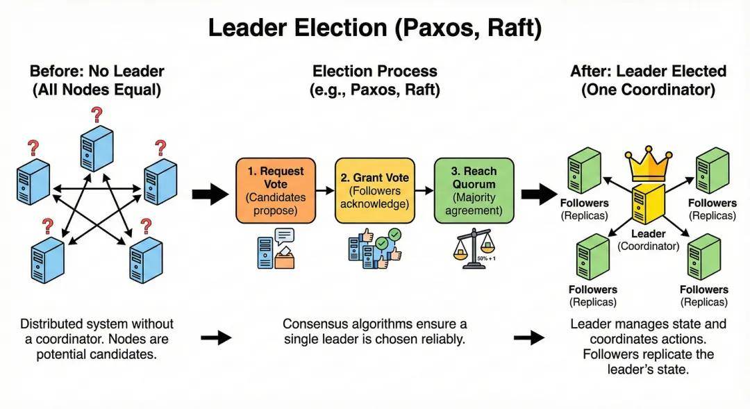 Paxos 和 Raft 等算法确保只选出一个领导者,并且所有节点最终都同意由谁来担任领导者。