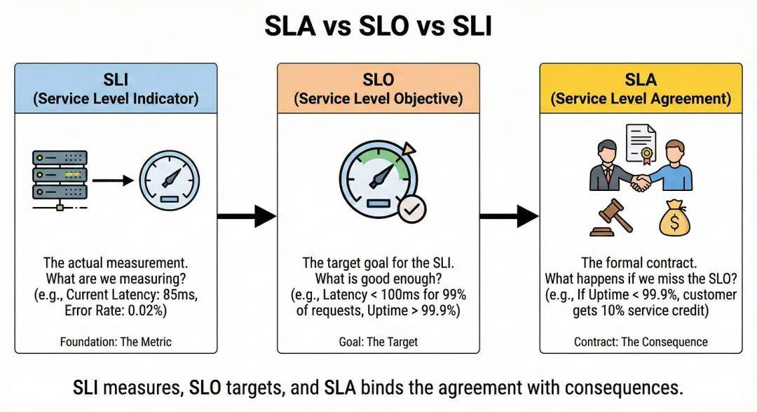 服务级别协议 (SLA )是对客户的外部承诺,例如“每月 99.9% 的正常运行时间”。