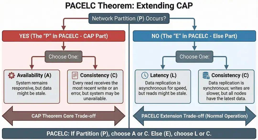 PACELC扩展了 CAP,并规定:如果存在分区,则选择可用性或一致性;否则,选择延迟或一致性。