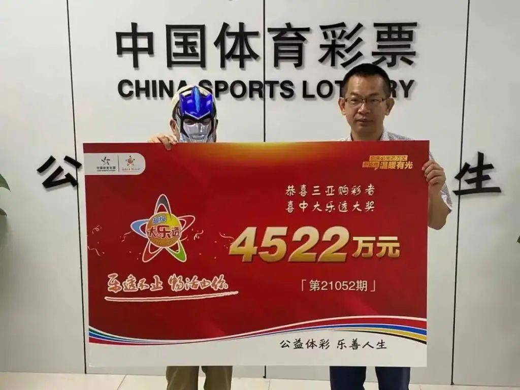 5 月 11 日下午,大奖得主张先生(化名)现身海南体彩中心兑奖大厅领取 4522 万元大奖,并当场奖励投注站老板 20 万元,同时又向希望工程捐赠 20 万元。据张先生说投注站老板非常热心,晚上中奖后给他连夜送奖票,所以决定给她奖励 20 万元。