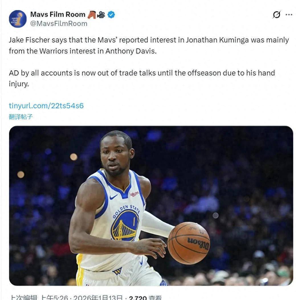 这一伤,把多米诺骨牌全推倒了。Jake Fischer说了,不光是老鹰,其他有意的球队,像猛龙什么的,也都悄没声地把报价撤了回去。浓眉的交易市场,在截止日前算是彻底关门了。独行侠现在的处境很尴尬。交易吧,没人出价;留着吧,他自己团队今年夏天肯定会逼宫,索要一份4年2.75亿美元的顶薪提前续约合同。一个33岁生日在即、过去一年出勤率不足四成的球员,要不要给这样一份超级养老合同?这成了独行侠管理层桌子上最烫手的一张牌。