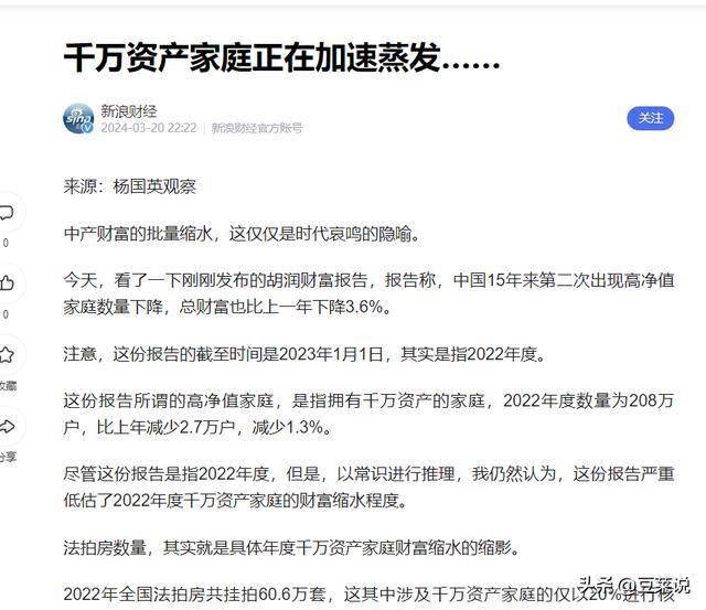 有的则因为负债,被追债缠身,日子过得一地鸡毛,根据胡润财富报告,2024年以来,中国资产千万以上的家庭,已经减少了上万户,可见形势有多严峻。